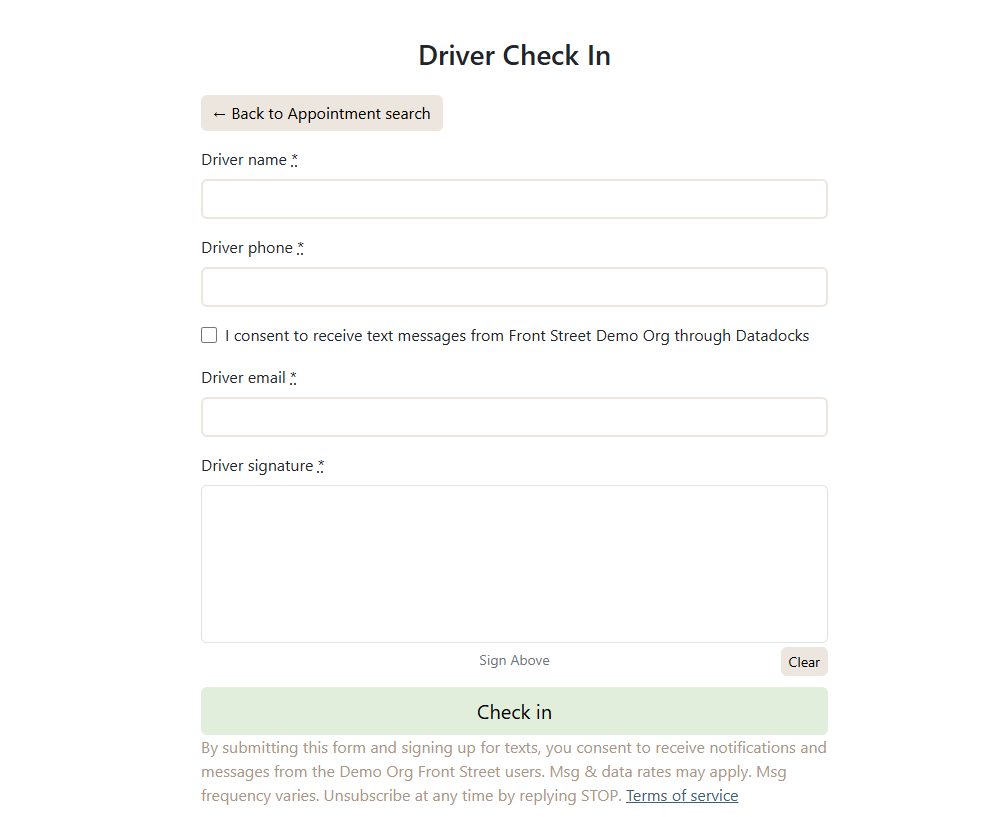 If you provided a phone number and gave consent, the facility may send you text messages with updates or instructions (for example, dock assignment or next steps).